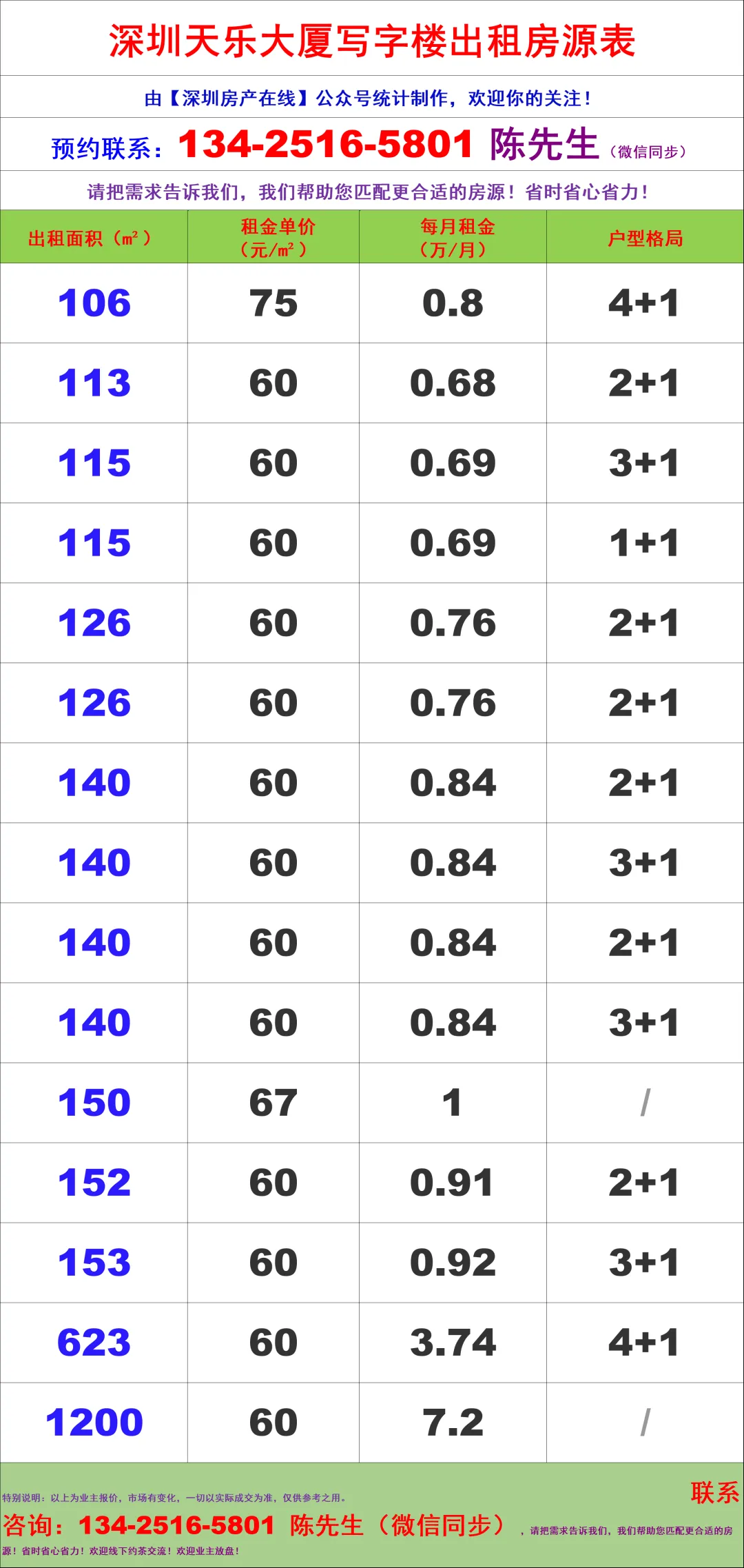【深圳房产在线】陈经理写字楼租售团队:134-2516-5801 (微信同步)
