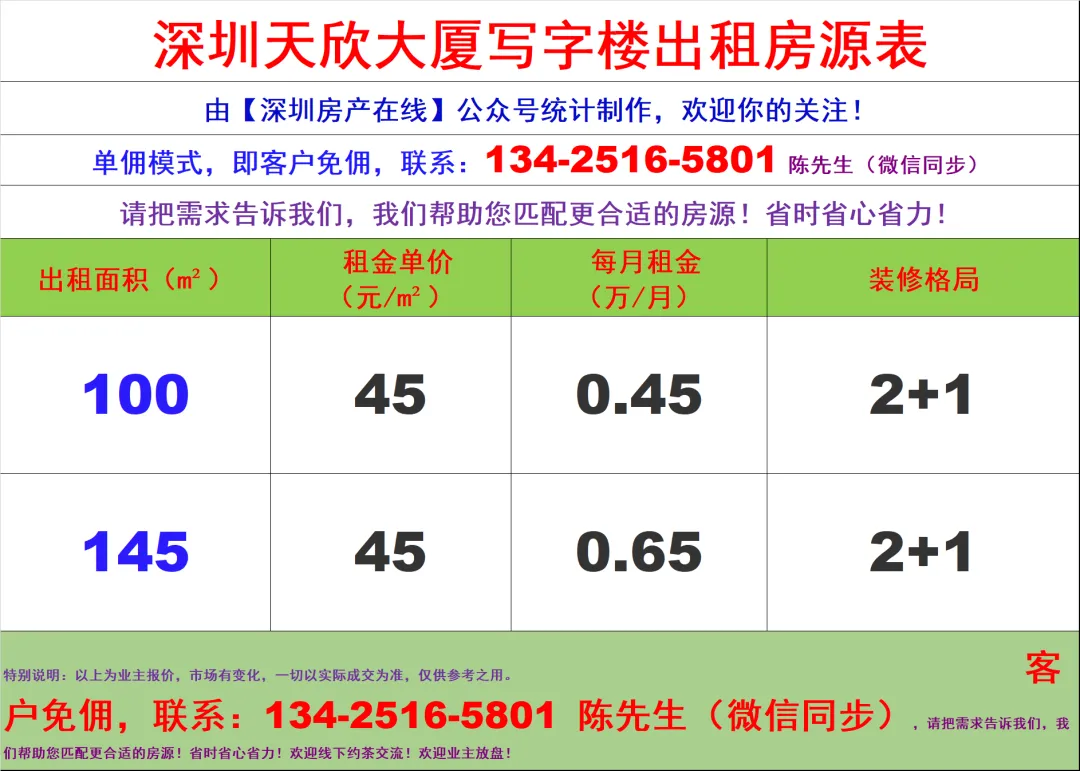 【深圳房产在线】陈经理写字楼租售团队:134-2516-5801 (微信同步)