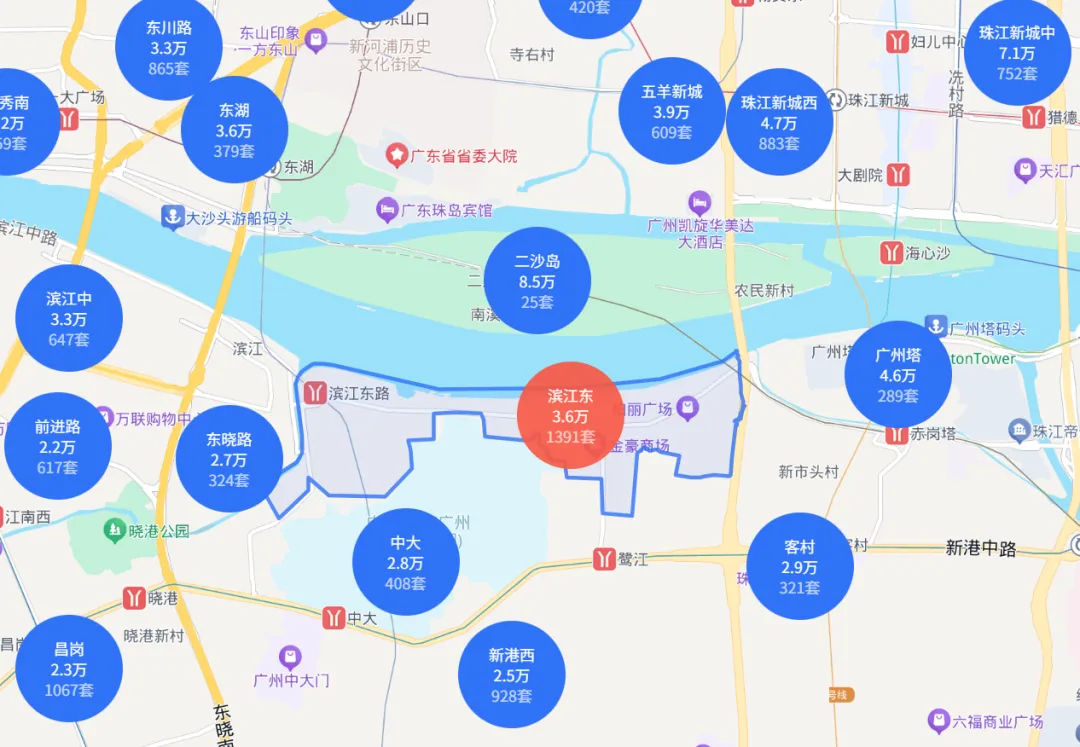 可如今再提滨江东,只剩一声叹息——2025年12月数据显示,板块二手房的成交均价仅3.75元/㎡,不足珠江新城东区的一半,在海珠区内连滨江西都比不上。