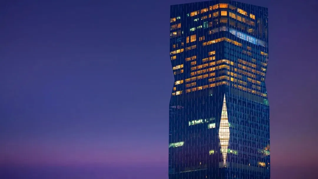 A soaring 30-story atrium acts as a fluid "time tunnel," embodying a vibrant, futuristic aesthetic.
