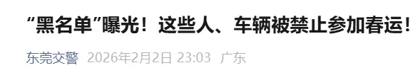 东莞交警对辖区36个月内有酒后驾驶、超员20%以上、超速50%(高速公路超速20%)以上驾驶人,36个月内发生道路交通事故致人死亡且负同等以上责任,最近3个完整记分周期内有1个记分交通违法记满12分,12个月内有3次以上公安机关交通管理部门记录超速违法行为等5类情形上驾驶人进行了排查,向社会公布一批禁止参加春运工作的重点驾驶人与车辆“黑名单”。