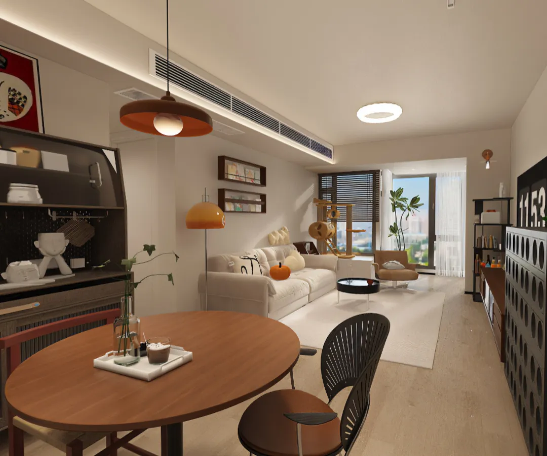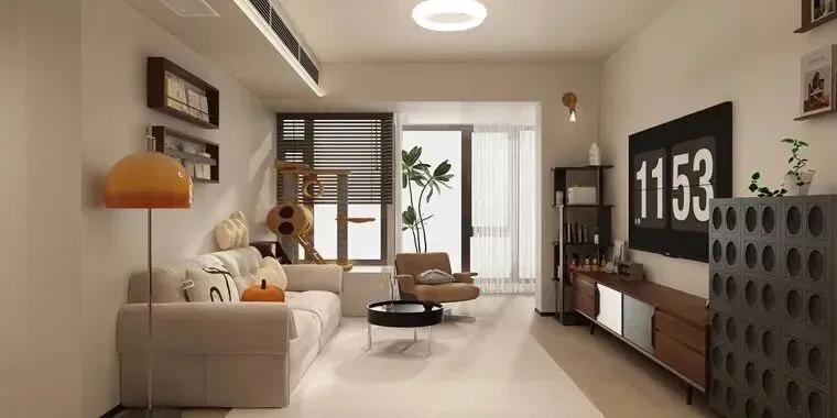 “深圳客厅的治愈感,是阳光、绿植与一只猫。” 米白沙发搭配橙色落地灯,撞色点亮温柔氛围。电视屏幕上跳跃的“1153”,仿佛记录着居家时光的数字诗。百叶窗滤过的光影洒在猫爬架上,深木电视柜陈列着生活趣味。这里,现代简约不冰冷,每一处都是为“猫狗双全”的理想生活定制。