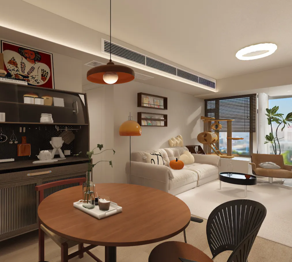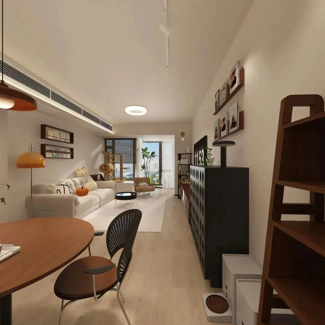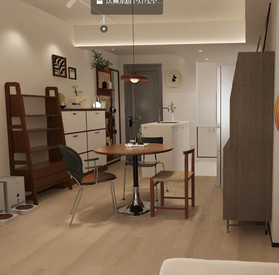 ▲ 当客厅与餐厅无界相连,家的互动感便产生了。米白沙发上的南瓜抱枕透着可爱,圆形木桌搭配异形椅,诠释深圳小家的不拘一格。一橙一棕吊灯悬于餐桌之上,如同温暖的日月同辉。黑色置物架是展示墙,养宠家庭也能在紧凑布局中,找到美感与功能的完美平衡。▲ 在深圳,窗景是最贵的装饰。沙发与圆形餐桌对望,形成流畅的生活动线。暖光吊灯笼罩着餐桌上的咖啡与绿植,沙发后墙面的书架装满精神食粮。落地窗外,城市天际线成为动态背景。百叶帘可随心调节光线,家的氛围,在简约与惬意中自由切换。▲给猫一个游乐场,给自己一个读书角。深圳小户型的精致,在于不浪费任何角落。木质猫爬架结构多变,是猫咪的探险乐园。一旁深棕色沙发椅搭配格纹抱枕,翻开书便进入另一个世界。窗外满眼绿意,阳光透过百叶洒入,这是都市中难能可贵的静谧疗愈空间。▲ 一个餐边柜,足以定义餐厅的格调。深色柜体上层敞开,展示着装饰画、复古收音机与陶罐,如同家庭美术馆;下层抽屉则藏起生活琐碎。圆形木桌呼应着柜体的温润,白色冰箱巧妙融入。在深圳的快节奏里,这个角落盛满了慢食的艺术与烟火气。▲ 谁说小户型不能有书房?墙面延伸出两排书架,书籍与藏品构成家的精神封面。橙色落地灯像个小太阳,照亮餐桌也温暖了阅读时光。沙发区与小圆桌就近在咫尺,功能区域叠加却不拥挤。深圳高效生活的另一面,正是这处可阅读、可饮茶、可发呆的复合角落。▲ 圆形木桌,是中国人对“团圆”的执念。三把不同风格的餐椅混搭,诉说着一家人的个性与包容。上方简约吊灯聚焦温暖,餐边柜黑白撞色,与木质层架共构丰富视觉。厨房时钟默默记录“法狮龙”集成吊顶下的烹饪时光。深圳的家,就是在简约体系中,生长出独特的生活痕迹。▲ 深圳厨房的精致,藏在细节里。白色柜体嵌入深木色线条,干净利落。操作台上,动物摆件与粉色花枝平添生趣,球形台灯如明月般温柔。木质层架上的瓶罐与绿植,是随性的烟火诗。灰色门扇静静伫立,整个空间在极简的基调下,充满静谧的灵动感。