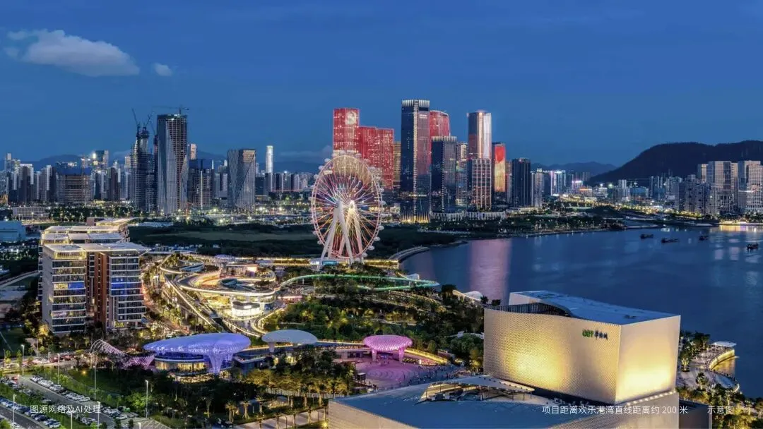 湾区之光摩天轮、湾区之声演艺中心、湾区之眼图书馆等世界地标环绕,公共文化艺术中心与宝安体育馆交相辉映。一路之隔欢乐剧场承办十五全运会闭幕式,以滨海实景舞台打造全球首个"城市全景闭幕式"(数据来源:新华社),世界舞台咫尺即享。