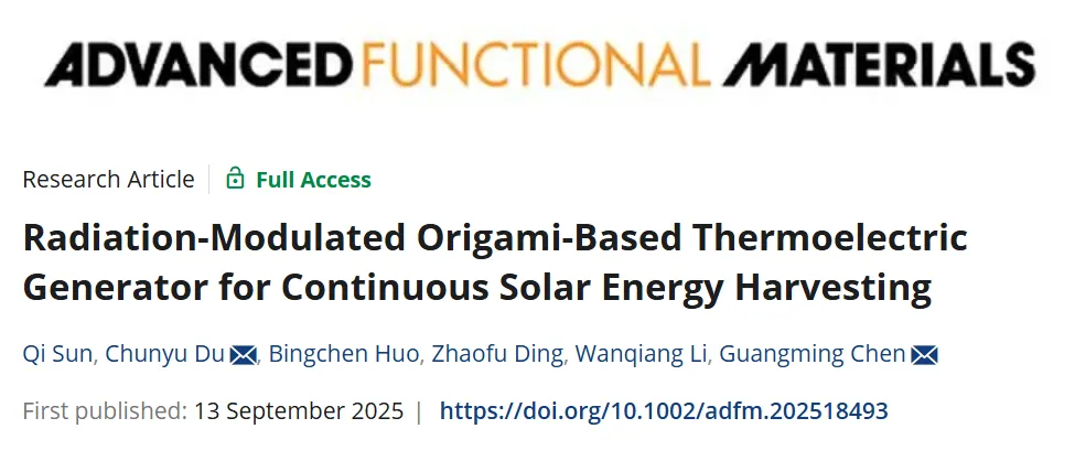 近日,深圳大学陈光明教授、杜春雨副研究员团队开发出一种基于折纸结构的辐射调制型太阳能热电发电机,成功将被动辐射冷却(PRC)与选择性太阳能吸收(SSA)层集成于可折叠器件中,实现了昼夜连续的能量收集。该器件在标准太阳光强度下可实现46.5 K的温度梯度与4.7 W/m²的功率密度,性能显著优于以往报道的STEG装置。相关论文以“Radiation-Modulated Origami-Based Thermoelectric Generator for Continuous Solar Energy Harvesting”为题,发表在Advanced Functional Materials 上,论文第一作者为Sun Qi。