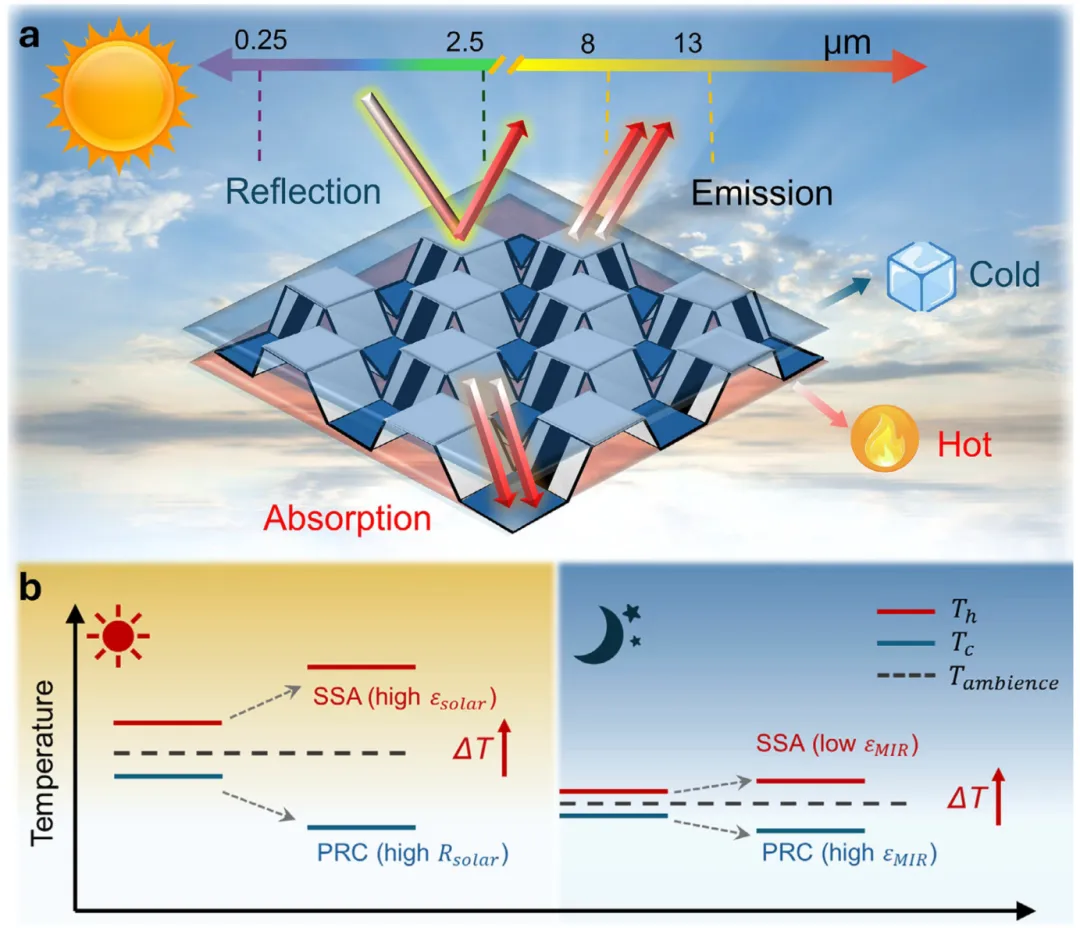 图1. STEG装置示意图与辐射调制原理 a) 折纸STE器件结构示意图 b) PRC薄膜与SSA薄膜之间ΔT的形成原理示意图