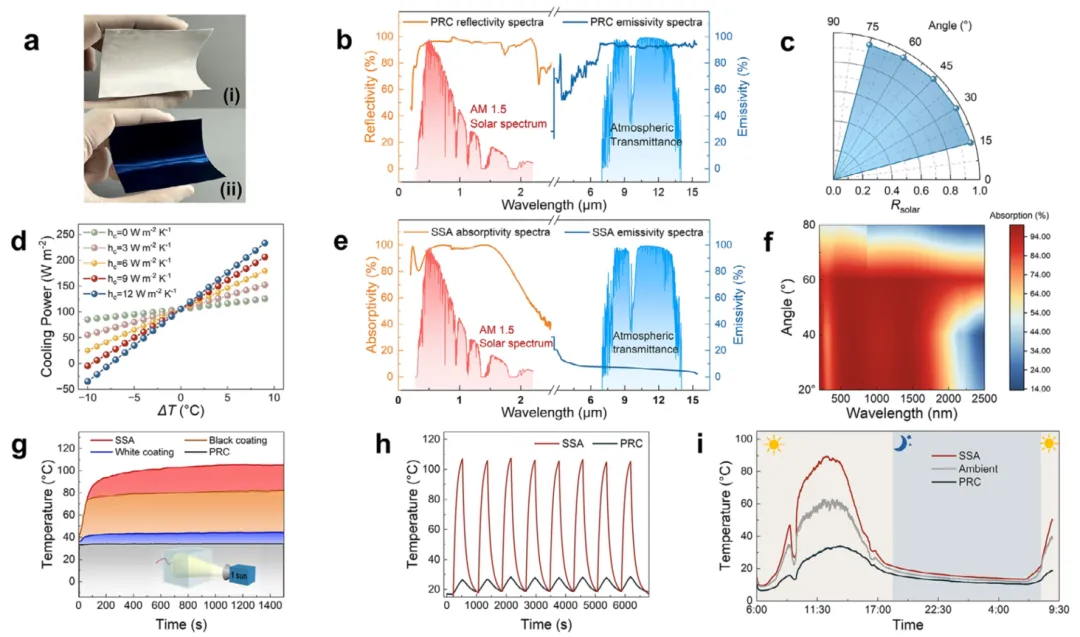 图2. PRC与SSA薄膜的表征 a) PRC薄膜(i)和SSA薄膜(ii)的结构示意图 b) PRC薄膜的反射率与发射率光谱,插图中红色区域为标准化AM1.5太阳光谱,蓝色区域为大气透明窗口 c) PRC薄膜在15–75°入射角下的反射率分布 d) 白天的净冷却功率 e) SSA薄膜的吸收率与发射率光谱 f) SSA薄膜在不同入射角下的太阳吸收率 g) 在1 sun光照下SSA层、黑漆、PRC层和白漆的温度测量结果 h) PRC和SSA薄膜在1 sun光照下的8次加热-冷却循环测试 i) PRC和SSA薄膜的实时户外温度测量结果