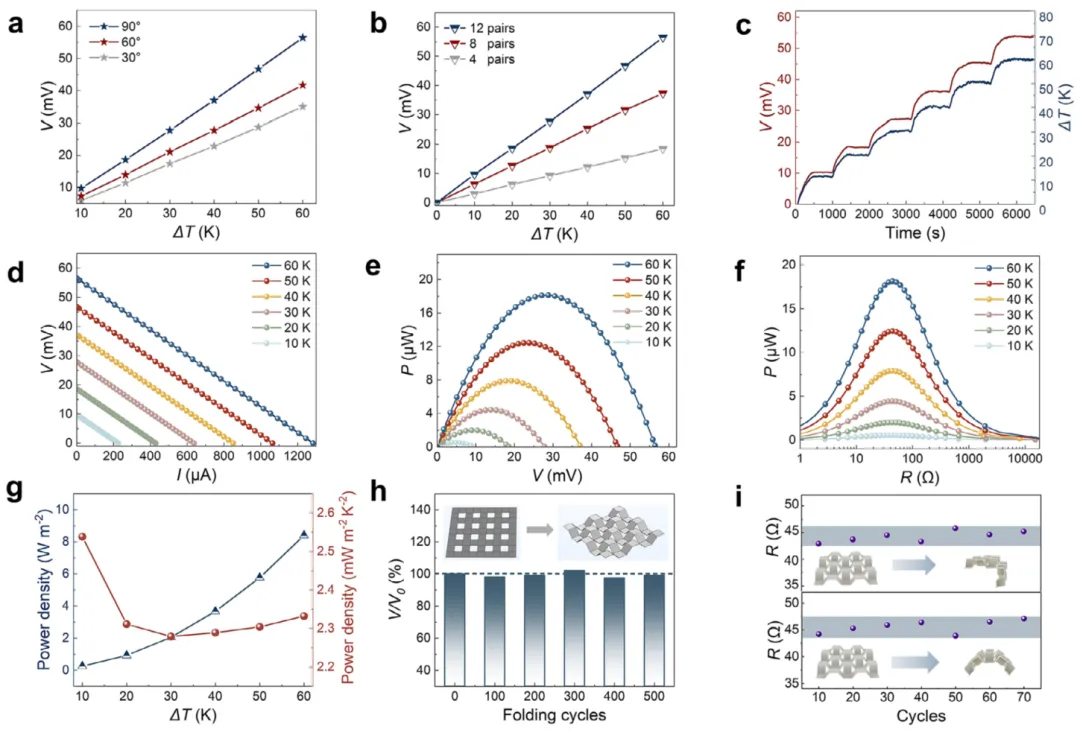 图3. 折纸TEG的热电性能 a) 输出电压随折叠角度和ΔT的变化 b) 输出电压随热电偶对数和ΔT的变化 c) 输出电压随温度的变化关系 d) 短路电流与输出电压在ΔT为10–60 K时的变化 e) 输出功率与输出电压在ΔT为10–60 K时的变化 f) 外部电阻与输出功率在ΔT为10–60 K时的变化 g) 功率密度和归一化功率密度随ΔT的变化 h) 循环折叠条件下的电压变化 i) 循环弯曲条件下的电阻变化