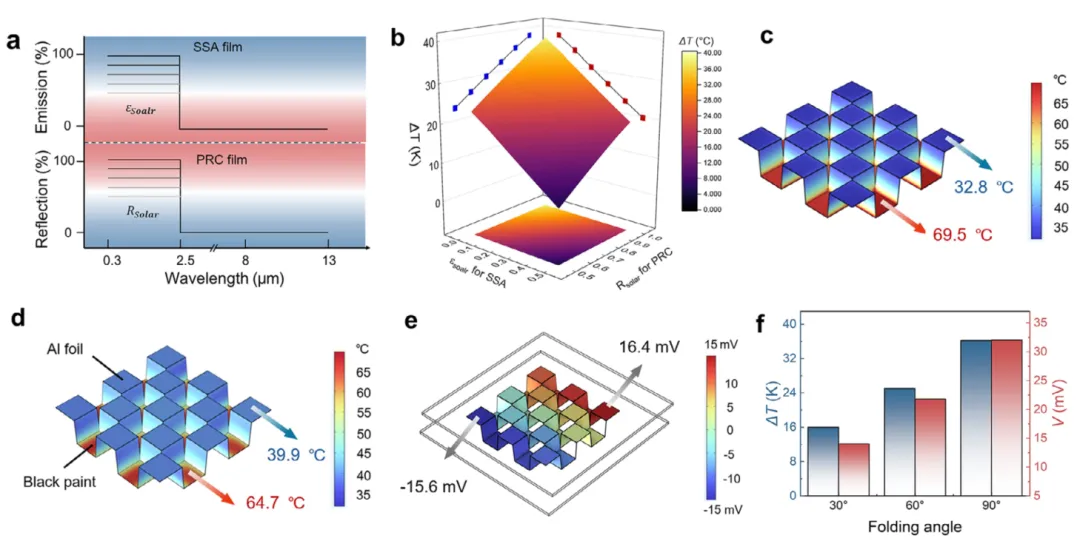 图4. 折纸STE器件的COMSOL有限元模拟 a) 不同εsolar的SSA薄膜发射光谱与不同Rsolar 的PRC薄膜反射光谱 b) 不同PRC的Rsolar和SSA的εsolar下的温度分布图 c) 90°折叠时STE器件的模拟温度场 d) 使用铝箔(冷端)与黑漆(热端)的温度场对比分析 e) 90°折叠时STE器件的模拟电势场 f) 不同折叠角度(30°、60°、90°)下的ΔT与电压变化