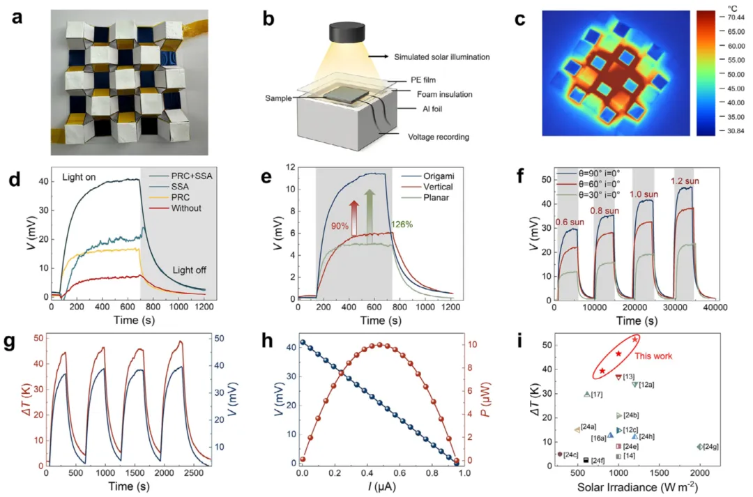 图5. 折纸STE器件在模拟AM 1.5G氙灯照射下的输出性能 a) 制备的折纸STE器件示意图 b) 室内测试系统示意图 c) 折纸STE器件的红外热成像图 d) PRC与SSA层对输出电压的影响 e) 不同结构STE器件的输出电压对比 f) 在不同太阳光强度(0.6–1.2 sun)和入射角下的电压输出 g) 循环测试中ΔT与输出电压的变化 h) 在1.0 sun光照下的功率、电压与电流特性 i) 不同太阳辐照度下STE器件的ΔT与以往报道数据的对比