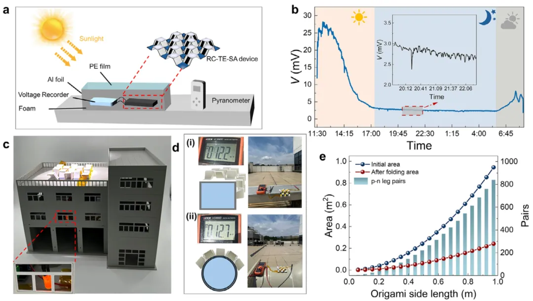 在实际器件测试中,折纸STEG在模拟太阳光下表现出40.2 mV的开路电压,显著高于仅使用PRC或SSA的配置。其输出电压随光照强度呈比例增长,在1 sun光照下达41.6 mV,且在不同入射角下仍具良好适应性。户外实测中,器件在白昼峰值电压为28.1 mV,夜间仍能输出7.7 mV,实现了全天候连续发电。