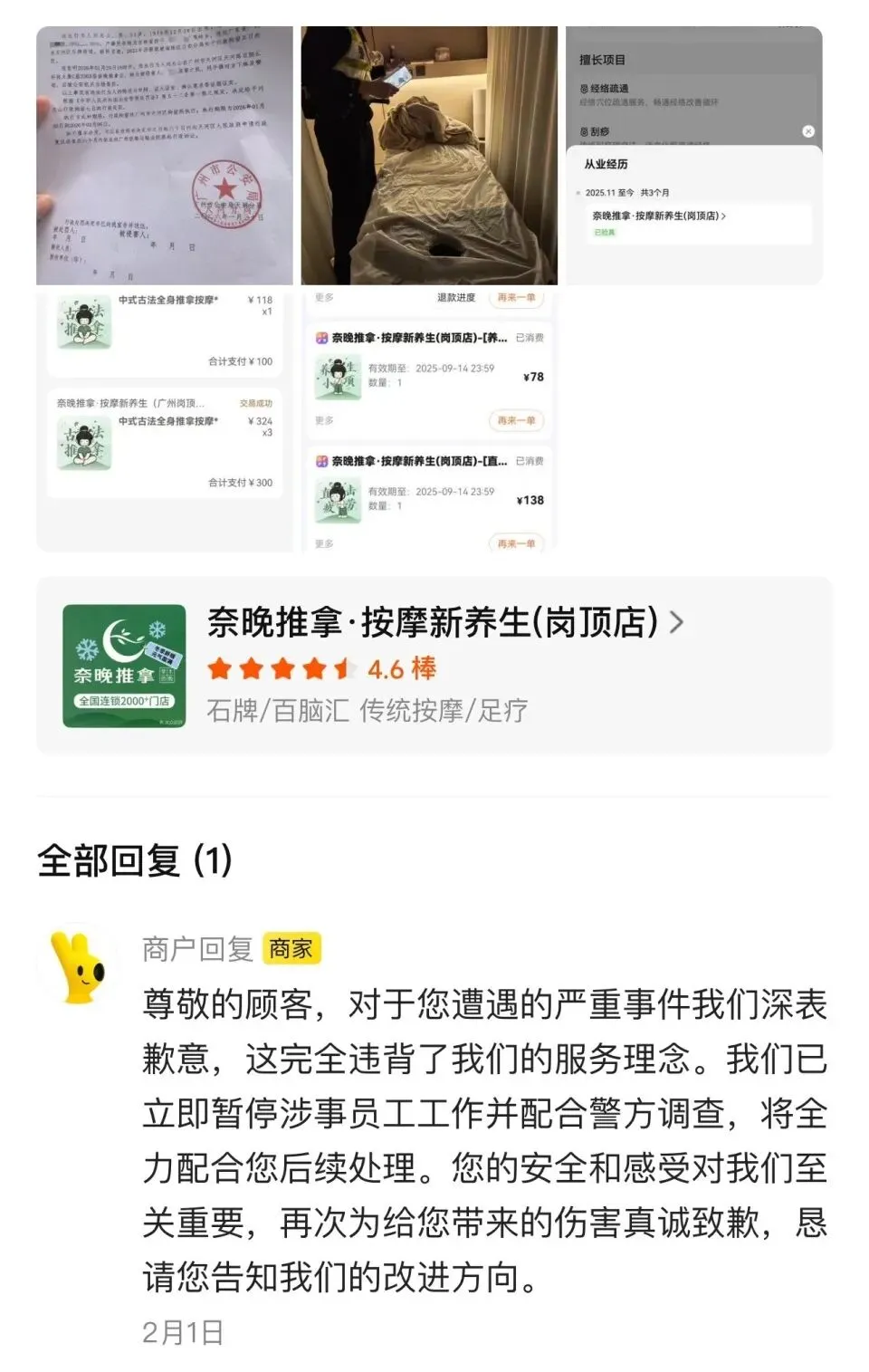 2月4日,记者联系到奈晚推拿广州岗顶店,工作人员表示,此事属实,店长正在处置。涉事员工刘某系刚招来的,还在试工期,第三天就被警方带走了。