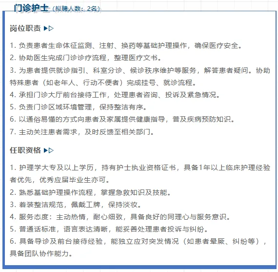 2.福利:五险一金、专项培训、节日慰问、带薪年假、健康体检、医护宿舍等。