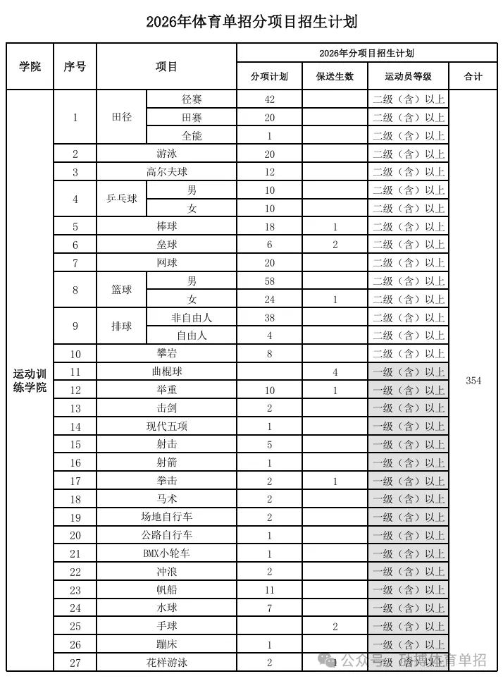 (1)招收国家二级含以上运动员的项目:田径(分田赛、径赛和全能)、篮球(分男女)、排球(分非自由人、自由人)、乒乓球(分男女)、羽毛球、网球、游泳、体操、艺术体操、技巧、摔跤(自由式、古典式)、棒球、垒球、柔道、高尔夫球、攀岩。