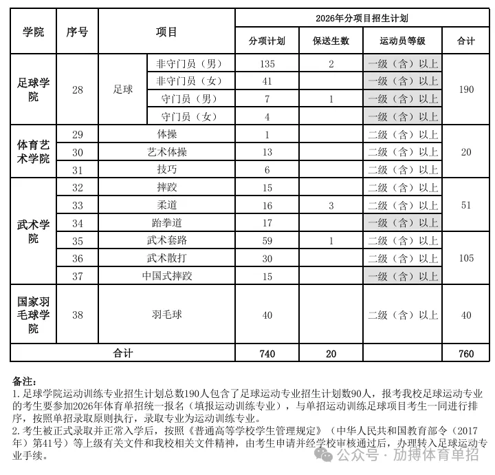 运动训练、武术与民族传统体育专业共计拟招生760人(含足球运动专业90人)。面向全国招生,不列分省计划。分项目招生计划见附件。