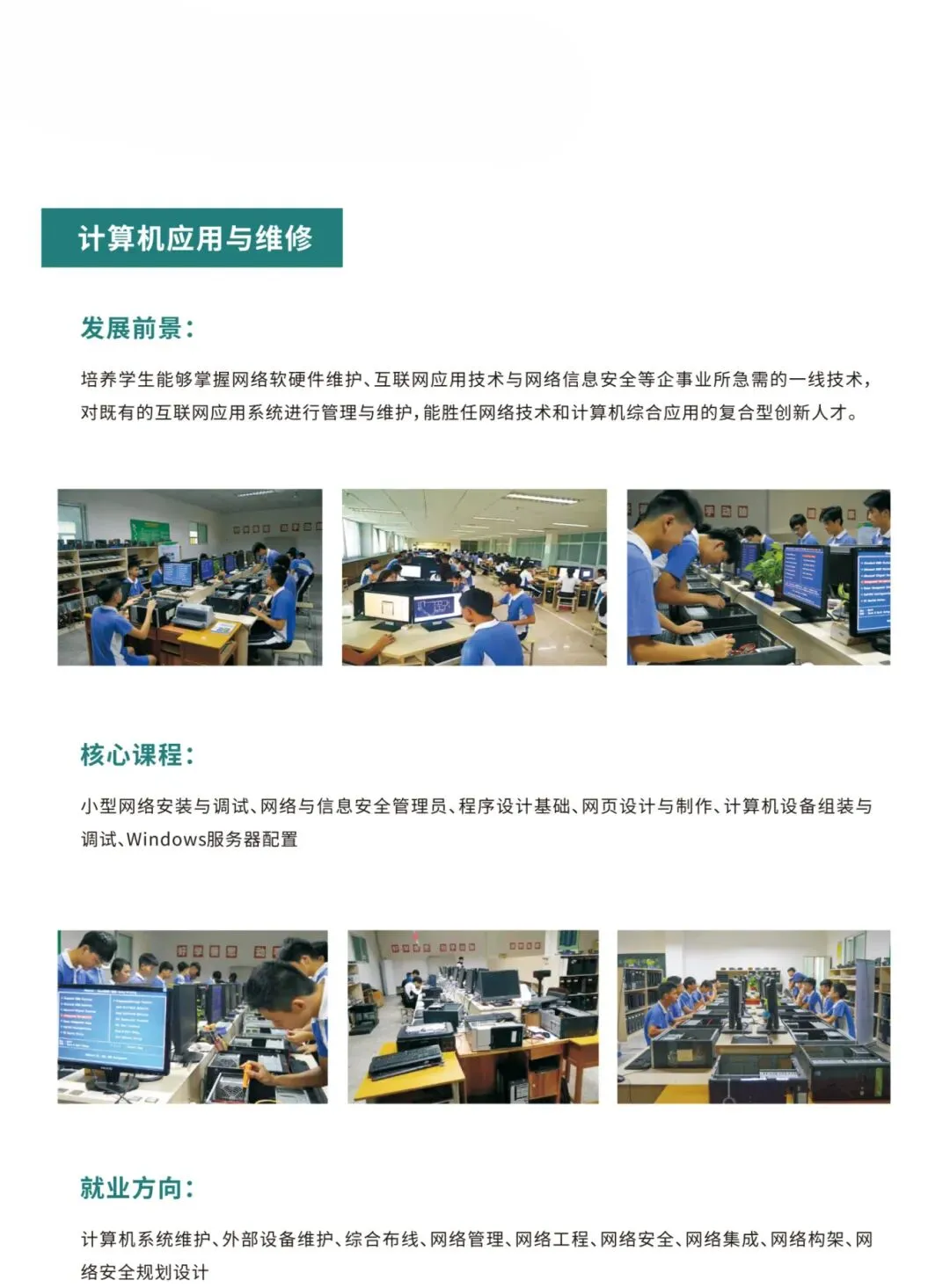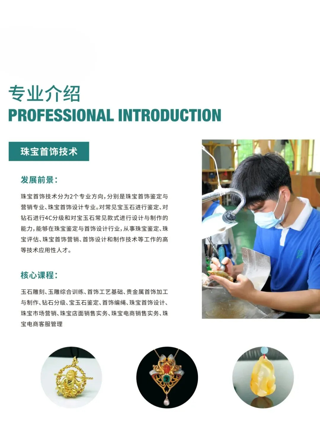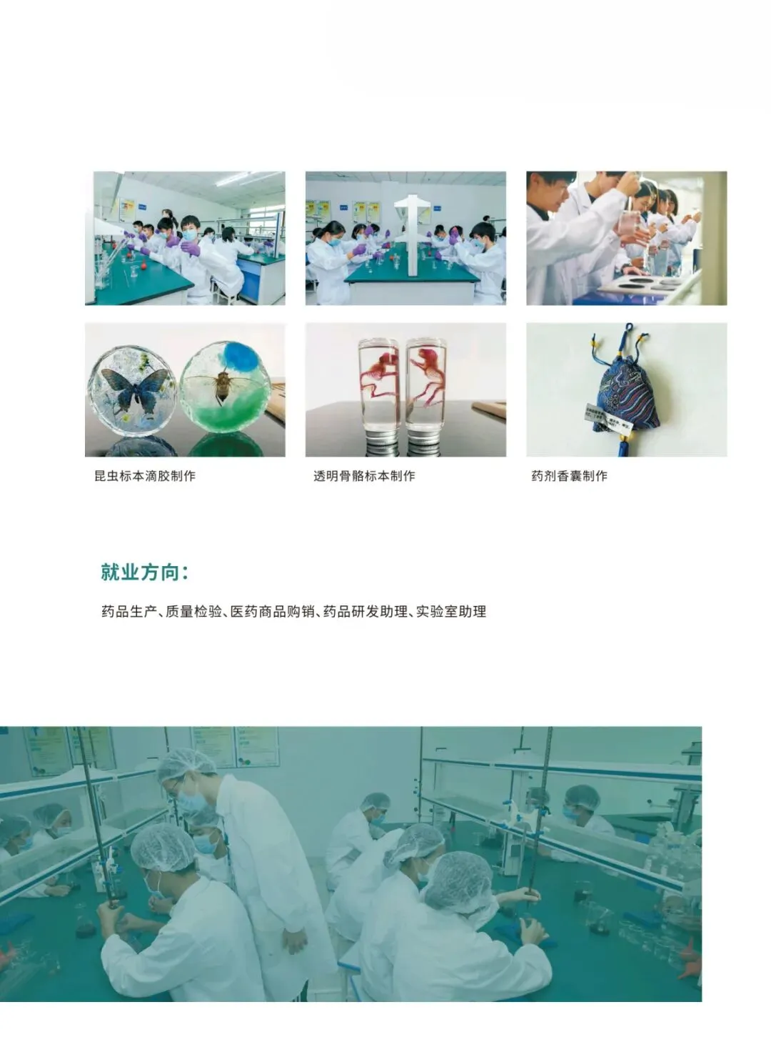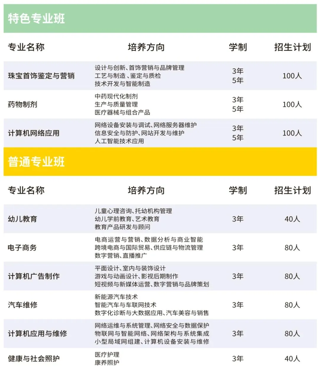 建校以来,学校积极探索践行校企合作工学结合一体化技能人才培养模式。坚持产教融合、校企双制育人的办学制度,建立了与企业共同制定专业人才培养方案、共建实训基地、共组师资队伍等共育技能人才的合作机制,现开设有珠宝首饰鉴定与营销、药物制剂、汽车维修、电子商务、计算机应用与维修、计算机广告制作、幼儿教育、健康与社会照护、计算机网络应用等9个专业。