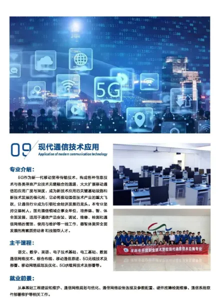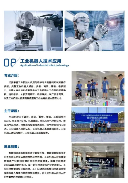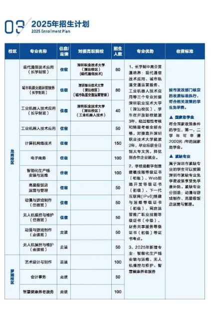 现有在校生3000余人,开设现代通信技术应用、工业机器人技术应用、城市轨道交通运营服务等12个特色专业,其中,3个专业是新增专业,分别是智能化生产线安装与运维、无人机操控与维护和智能健康养老服务。与深圳职业技术大学、深圳信息职业技术大学、华为、汇川技术等高职名企共同构建了中高职衔接,长学制贯通培养等多元育人体系。