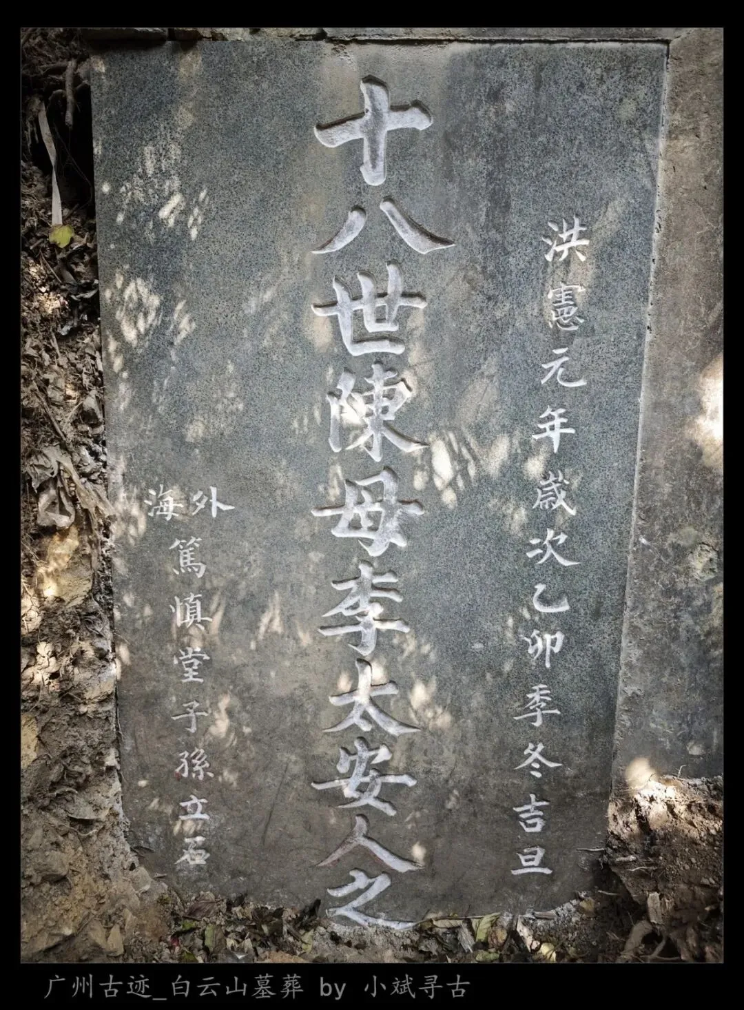 墓葬四周山界情况未明,环垄正中镶嵌青石材质墓碑,刻“十八世陳母李太安人之……”,上款“洪憲元年歲次乙卯季冬吉旦”,下款“外海篤慎堂子孫立石”,墓后一级护岭。