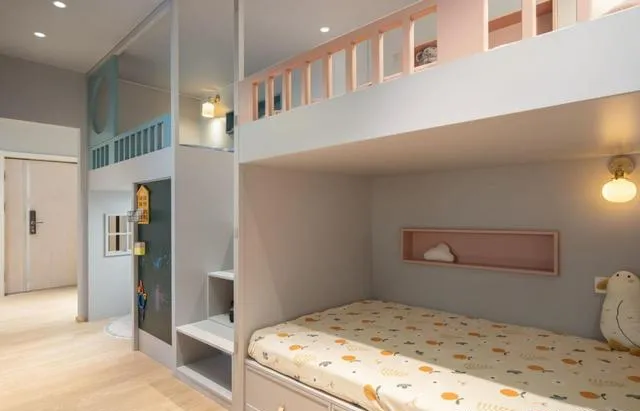从多功能区进,左边就是2组高低床,楼梯在中间,两侧床对称。一个蓝色,一个粉色,细节处全是爱。下铺睡奶奶和小男孩,上铺住外婆和小女孩,颜色搭配俏皮,储物一流。