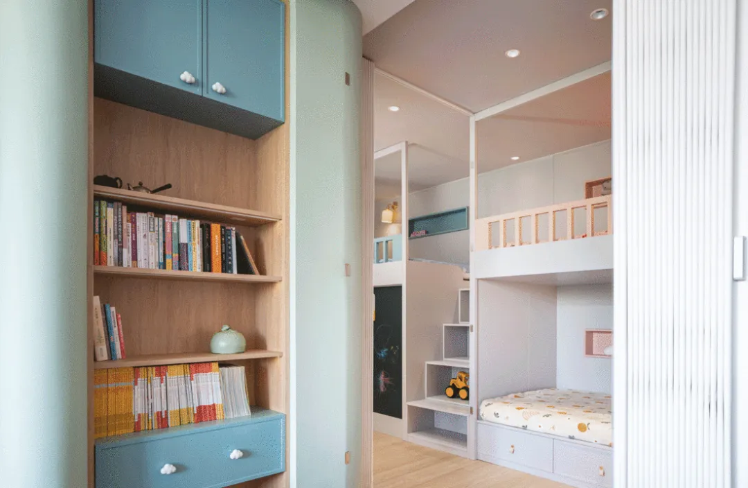 下半墙的拱形收纳柜,别说孩子喜欢,大人看了都想摸一摸吧?有些家,就是把温柔和童趣都写进了细节里。