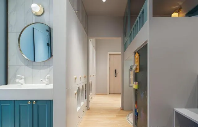 一进门就是多功能区域,玄关、瑜伽区、女儿舞蹈练习场、小书屋全融合。收纳柜做成了墙体,甚至衣柜门还是镜面,既是练舞镜又能拓展视觉空间。
