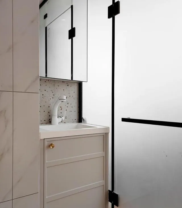 主卫和次卫全做干湿分离,一个配双水龙头(再也不用抢洗脸池),一个麻雀虽小五脏俱全。玻璃隔断引入自然光,私密性和明亮度兼顾到位。卫生间的高级蓝白撞色,真是让我这个干装修几十年的人也得夸一句:“洋气!”