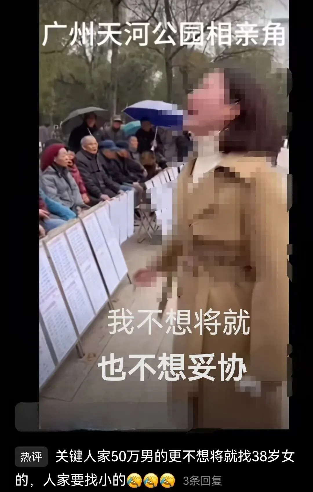 广州天河公园的树荫下,38岁女高管,在第28次相亲被拒后的崩溃嘶吼:“我不想迁就,也不想妥协,我38岁了,一直未婚,要学历有学历,我硕士毕业,要工作有工作,我年收入50万,想找一个年收入50万、门当户对的未婚男人结婚过日子,咋就这么难?”