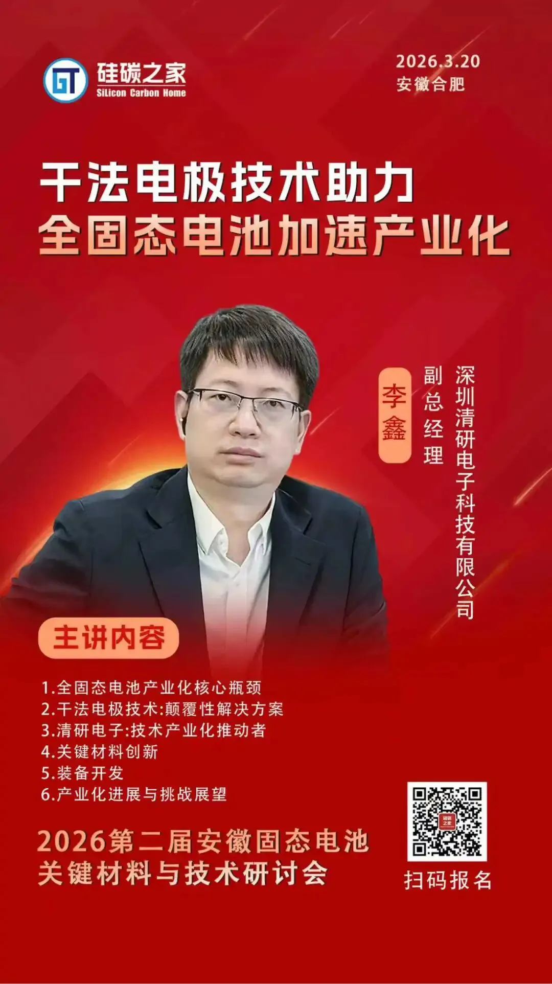 2026年3月20日,由硅碳之家主办的“2026第二届安徽固态电池关键材料与技术研讨会”将在安徽合肥举办,届时深圳清研电子科技有限公司副总经理李鑫,将分享《干法电极技术助力全固态电池加速产业化》主题报告。