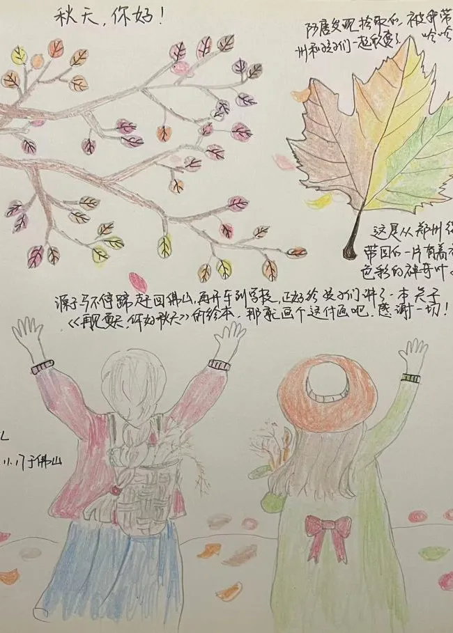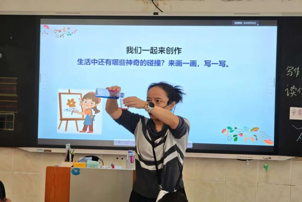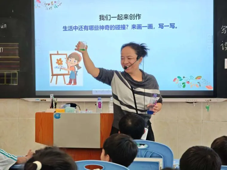 当然我也想尽办法能给孩子们带去魔法的展示,在给一年级孩子们上想象力主题的绘本时,我结合绘本中的内容带去了各种颜料,在课堂上给他们展示两种颜色会碰撞出什么样的颜色,得到了同学们的哇声一片,我相信那一刻满足展现在了我的笑脸上,也印在了他们的心里。我也会经常给他们分享我生活中的经历,有一次从郑州跑完马拉松回来,因为刚好在讲到大自然秋天的绘本,我给他们展示了从郑州街头捡回来的巨大的梧桐树叶,以及一片同时呈现有绿、浅黄、金色、棕色的树叶,当时孩子们好奇地睁大眼睛全班惊叹的反应让我愣住了,简直怀疑这些个孩子们怎么这么会捧场呢?但我马上意识到我的固定思维又在框住我了,孩子们的那种反馈是真实而贴切的,在那一瞬间,我突然有一种沸腾着的幸福感,我的一个小小的随意举动变得如此的意义重大,这不就是我一直在说的双向滋养、双向奔赴的旅程吗?