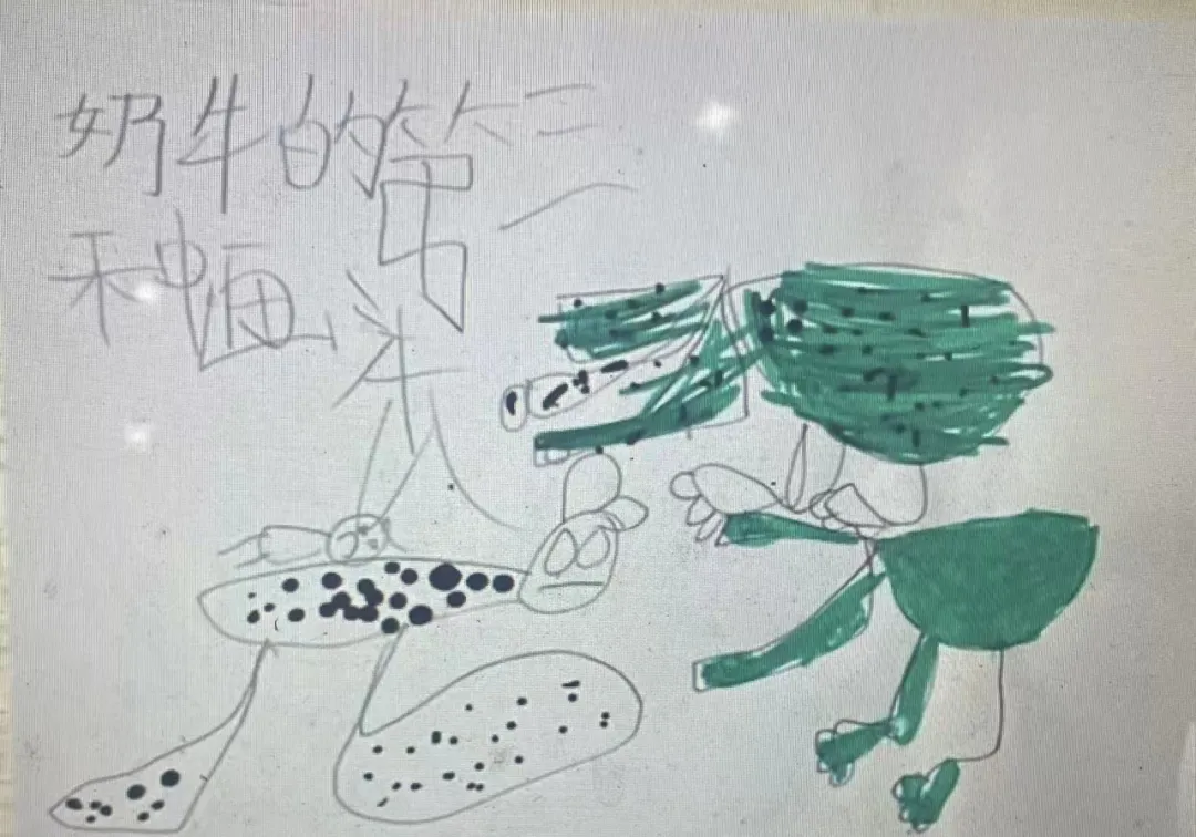 记得刚开始几节课时我还没有完全意识到小孩子画作背后的意义,慢慢地我才清醒意识到其实这个年龄段孩子的作品就是用来表达的,他并不是画出来让大家都能一目了然看得懂,而是有着他自己的世界,记得在一年级《怎样画一头奶牛》的绘本课后,我邀请一个小朋友来分享一下他的画,我第一眼看到时也没有什么概念,结果他跟我讲述了一个完整的故事:这是有一只鳄鱼吃掉了一头奶牛,结果慢慢地鳄鱼的身上长满了黑白的斑点,怎么也消不掉,然后鳄鱼就难过地哭了!话说当时那个瞬间我也想哭了,因为我想在以前的课程中我是错过了多少精彩的故事,丢失了多少小朋友那天真神秘的世界的那个瞬间,不过不怕,我这不就马上又从孩子们身上学到了如此重要的一课,让我谨记我以后也要一直时时努力做个保持好奇心好学的孩子!