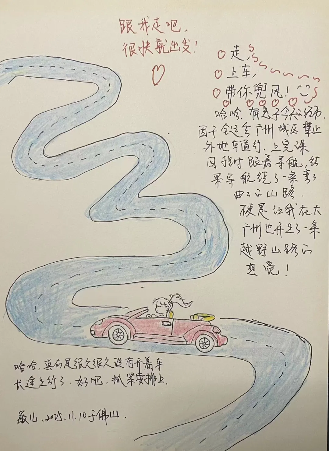 说实话在构思和开始写这篇总结时我并没有想到要写下这个小标题,可是好象随着文字的堆砌,情感的流动就自然而然地也想看看这个被照亮的自己做了些什么?因为我珍爱着孩子们,但我相信孩子们也珍贵着我,所以任何都值得记录一下。因为这份珍爱,从我走进校园的第一天起,我所有的时刻表都围绕着孩子们而展开,记得后来跟同伴聊起来,说我压根就没想过当走上讲台作为老师的身份后可以请假缺课的情形。因为我喜欢,我期待着和孩子们的每一次相聚,所以每次上课来回一百来公里的路程都成了这条爱心路上的装饰,朋友们总是会问我开车那么远不累吗?哈哈,到目前为止,作为中国好司机的我确实还没有这方面的困扰,我从来没有过累的感觉,当然也可能是被更多的欢笑和喜悦给冲走了。还记得中途遇上广州全运会的举办对限行的规定,而我也并没想要不就不去了请一两次假吧,只是在地图上搜索绕行路线,结果走了几次弯弯曲曲的山路,路窄人少,会车困难,但我却是欣喜地像发现了新大陆一样,把我的经历画了下来又告诉孩子们,告诉我好羡慕他们家园周边原来是这么一个山清水秀的地方,让他们多去看看大自然的神奇,多去看看周边的世界。虽说我能适时调整,但确实因为限行让每次的行程不只是多了高速通行费,还多出了近60公里也会让我有了疲惫的感觉,但好在疲惫还没积累到我真的想休息的时候,限行就结束了,然后这也就又成为了一段美好且珍贵的回忆。