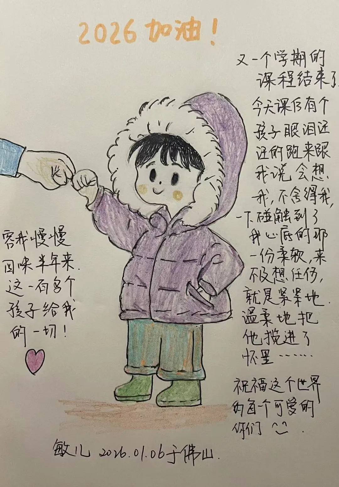 在开头提到的最后一节课后,等我回到家又画了一幅画,并写上了2026加油的字样,那是说给自己听的,更是给孩子们的祝福,感谢孩子们陪伴着我的这54节课,孩子们的每一个笑脸,每一次互动,构成了我2025年秋季学期最丰富的底色,也是我跟孩子们一次共同成长的生命旅程,我也希望这54节课,我带去了一些阅读和好奇的种子,能在某些个孩子的心底会扎根发芽,带着他们去真诚探索这个世界的勇气。因为实在太多的话说也说不完,即使能说完,而语言也有着它的局限性不能真实地表达全,所以就这样带着期待,再加多一张我曾经因为被这个笑容吸引而画下的一张画(在我展示这张画时,很多孩子开心的大笑兼毫不吝啬的夸奖说好漂亮,也有孩子豪爽地大笑着毫不遮掩地说好丑呀,不过都不影响曾是我自己最喜欢的一张画,哈哈),带着笑容,带着梦想继续下一个故事的启程吧。