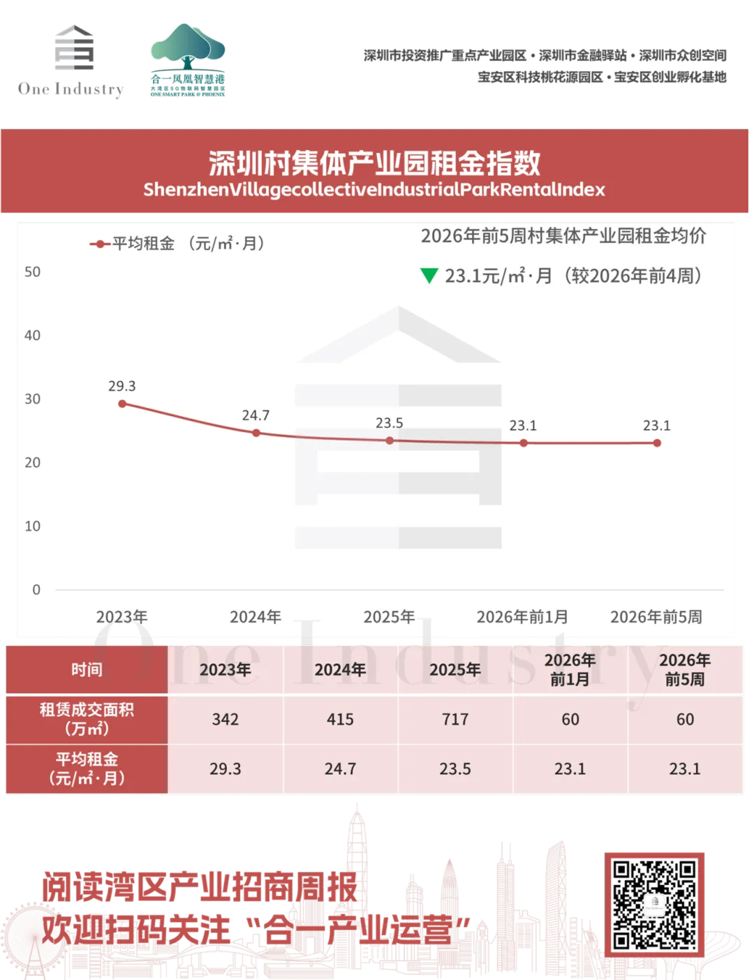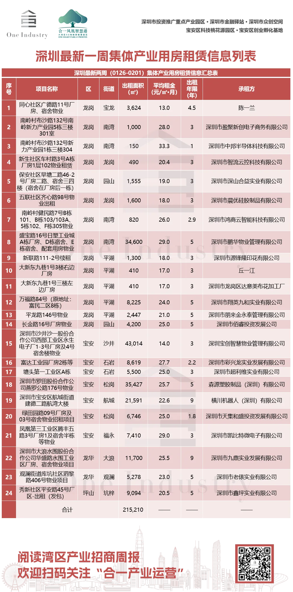 深圳最新一周(0126-0201)村集体厂房等产业用房租赁成交24宗,出租建面约21.5万㎡,位于龙岗、宝安、龙华、坪山,平均月租金为22.9元/㎡。