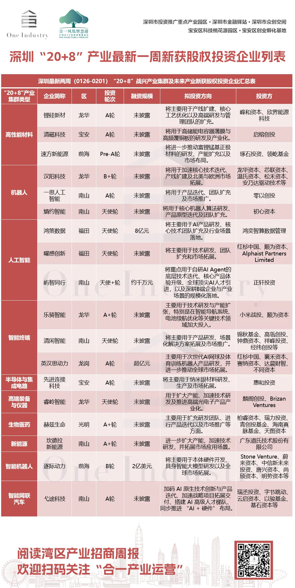 备注:本表格中仅统计符合深圳“20+8”产业集群类型的企业,不含股权融资企业;统计口径上,最新一周(0126-0201)对应财联社创投通数据周报(0124-0130)、私募通数据周报(0124-0130)、睿兽Pro投融资周报(0124-0130)和36氪融资周报(0124-0130)等平台数据。