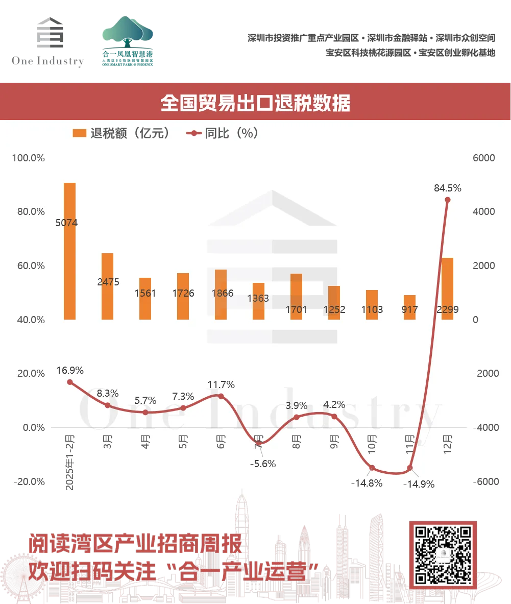 据中国财政部国库司统计,2025年出口退税总额21337亿元,同比增长10.7%,其中12月份退税额2299亿元,同比增长84.5%。