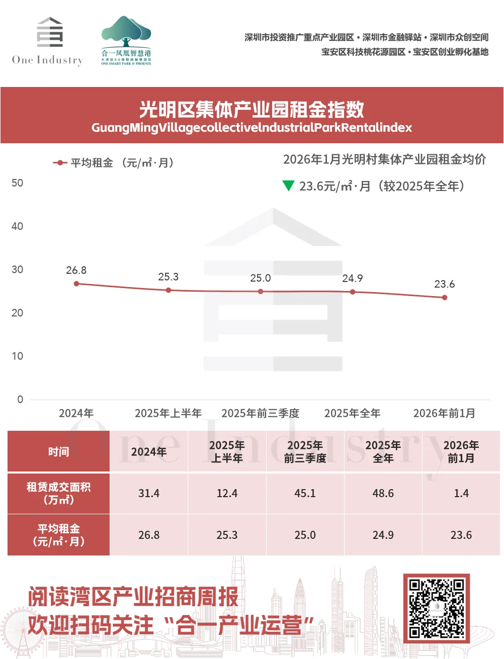 2026年1月,深圳光明区仅1宗集体产业园厂房等产业用房租赁成交,建面约1.4万㎡,月租金为23.6元/㎡。