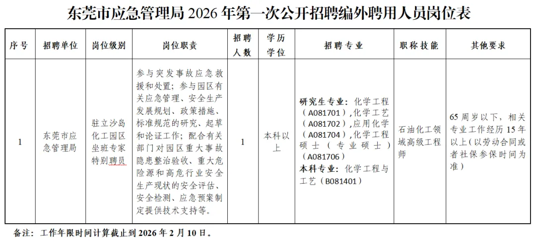 东莞市应急管理局驻立沙岛化工园区坐班专家特别聘员1人,具体岗位情况和要求详见下表。
