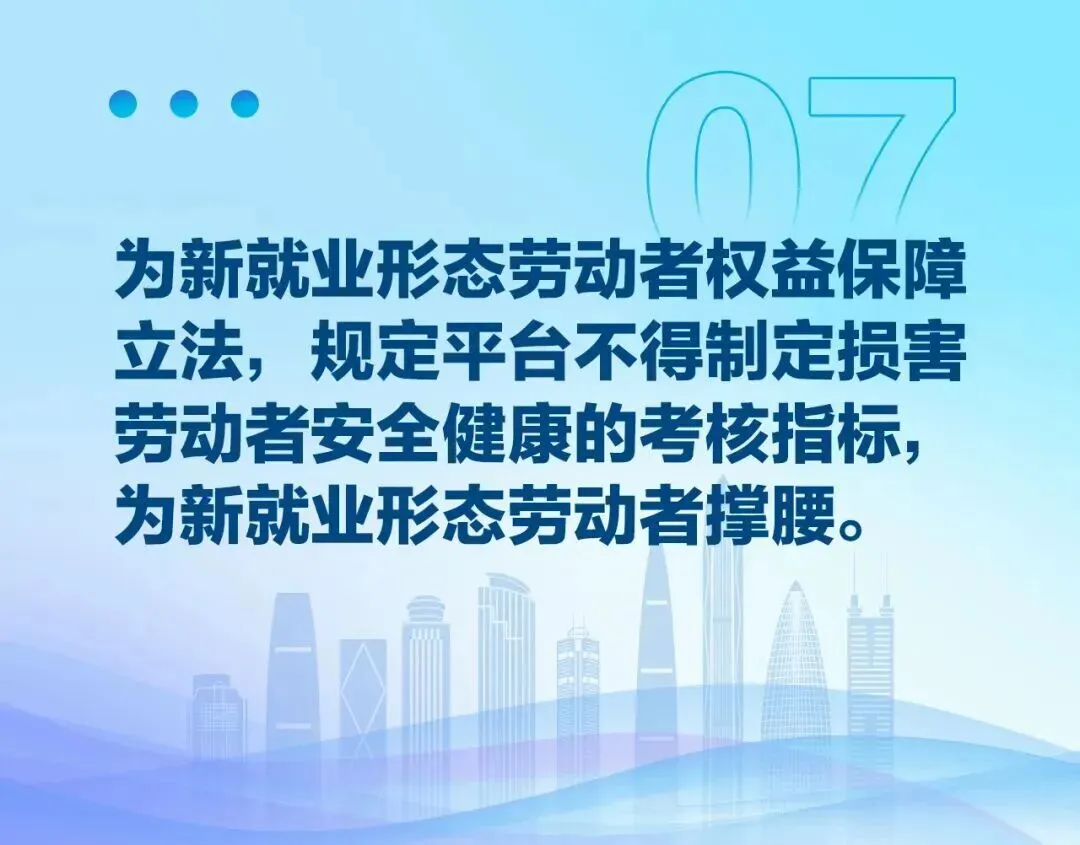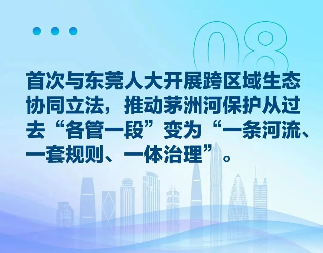 全面落实《河套深港科技创新合作区深圳园区发展规划》要求,围绕河套深港科技创新合作区发展面临的新情况、新形势,积极争取全国人大、省人大常委会支持,聚焦河套深圳园区的三大发展定位和阶段目标,出台河套深港科技创新合作区深圳园区条例,充分发挥特区立法的创新变通优势,着力破解深港协同创新机制瓶颈,在创新要素跨境便捷流动、科研管理体制、创新容错机制等方面探索突破,建立高度开放的特殊监管体系、更加灵活的科技创新体制机制,以及与国际规则接轨的人才制度等,助力河套合作区加快建设国际科技创新高地。贯彻落实深圳打造“民生幸福标杆”的部署要求,紧盯“提升医疗服务与保障能力”这个人大代表票决第一的民生实事项目,历时8个月深入调研,赴上海、成都、香港等地学习借鉴先进经验,形成高质量调研报告,相关建议被吸收采纳到我市“十五五”规划编制中。在此基础上,出台关于突出临床重点专科建设进一步提升医疗治疗水平的决定,明确“十五五”时期,按照国家临床专科能力评估标准推进100个临床重点专科建设,建成30个重点疾病专科医疗中心,实现临床专科能力快速提升,加快实现“大病不出深圳”的愿景。抢抓合成生物产业发展机遇,出台促进合成生物产业创新发展若干规定,精准破解产品审评审批周期长、应用推广进程慢等困扰企业发展的痛点难点问题,推动技术审查和行政审批分离,持续优化审批条件、审批流程,进一步强化融资、空间、应用场景等要素保障支持,降低合成生物初创企业成本。在“三新食品”、化妆品新原料等领域,进一步强化央地协同,推动与国家、省卫生健康部门联动建设食品安全风险评估技术合作中心,为合成生物企业提供更加高效便捷的审评和技术检测服务,让市民能够享受更多创新成果和实实在在的利好。贯彻落实中办、国办《关于解决拖欠企业账款问题的意见》,出台全国首个加强政府投资项目工程结算、竣工决算工作的决定,解开企业账款“连环套”,打造“在深圳做政府投资项目不拖欠”的良好营商环境口碑,擦亮深圳营商环境“金字招牌”,以法治力量稳定市场预期、提振企业信心。2025年政府投资项目计划进一步调增结决算款规模,较年初安排增长约3倍,“双算”尾款资金占比由1.3%提高至12.2%,有效保障政府投资项目支付需求,切实缓解企业资金压力,让企业得到真金白银的实惠,受到广泛好评。全国人大常委会预算工委专刊推介深圳经验。按照市委工作安排,聚焦提升财政政策效能和资金使用效益开展监督调研,推动补贴补助政策绩效评价纳入市委巡察内容,推动政府成立工作专班,对全市各项财政补贴补助政策进行自查评估,并上线专项资金统一管理平台,从源头上有效规范和优化全市财政补贴政策,推动惠企经济政策和财政资源配置更加精准、更可持续。积极组织四级人大代表深入汕头、河源、汕尾、潮州4个对口帮扶地区和湛江市,在摸清对口地区市情、产业发展需求和代表优势资源的基础上,建立产业引进需求、产业资源匹配“两个清单”,搭建产品购销推广、技术支撑服务、产业合作共建“三个平台”,健全项目跟踪落实和帮扶协作“两个机制”,形成“需求摸排-精准对接-项目签约-跟踪问效”的全流程工作闭环,推动签署了36项产业合作协议,意向金额超亿元,构建起“人大搭台、代表助力,产业帮扶、互利共赢”的代表参与“百千万工程”履职新路径。该项工作获省、市领导的充分肯定和批示。围绕就业这个“最大的民生”,出台关于加强新就业形态劳动者权益保障的决定,精准破解“劳动关系认定难、参保难、算法裹挟”等痛点难点,明确了平台企业的相关责任和义务,规定平台不得以差评为由随意扣钱,不得制定损害新就业形态劳动者安全健康的考核指标,鼓励企业为新就业形态劳动者提供社会保险补贴,完善新就业形态劳动者职业发展机制,加强新就业形态劳动者职业技能培训,全方位全链条打通权益保障“最后一公里”,更好保障深圳约170万新就业形态劳动者权益,也为平台经济的规范健康发展注入法治动力。紧扣推进都市圈生态保护与协同治理新要求,首次开展跨区域生态协同立法,出台茅洲河流域协同保护若干规定,实现了跨境河流治理从依赖行政协调到依靠法治保障的根本转变。《规定》明确建立跨区域沟通协商和流域信息共享机制,深化两地行政执法协作,有效提升跨区域执法效能,并创新将文化与经济协同纳入立法范畴,明确共同加强流域历史文化遗产和治理文化保护。同时,强化人大监督,通过两市人大常委会协同开展执法检查等方式,确保法规在茅洲河流域有效贯彻实施。坚持“高站位”“大格局”、突出“小切口”“深调研”,发动全市各级人大代表开展“我为‘十五五’规划建言献策”活动,收到590名代表提交的意见建议1068篇,通过广泛深入察民情、听民声、汇民智,形成“1+5”调研成果(1项规划编制调研报告和5项专项调研报告)送市委、市政府决策参考,多项建议被吸收采纳,切实把社会期盼、群众智慧、基层经验充分吸收到“十五五”规划编制中。相关成果获得省人大和市委主要领导肯定和批示。贯彻落实习近平总书记对人大提出“充分发挥四个方面作用”的重要要求,提请市委出台《关于充分发挥人大在密切同人民群众联系中的带