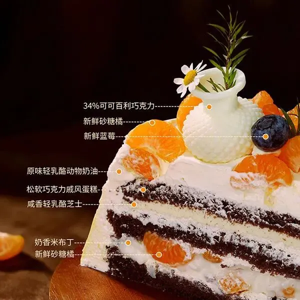 ◯ 原料精选:34%可可百利巧克力、新鲜砂糖橘、新鲜蓝莓、原味轻乳酪动物奶油、松软巧克力戚风蛋糕、咸香轻乳酪芝士