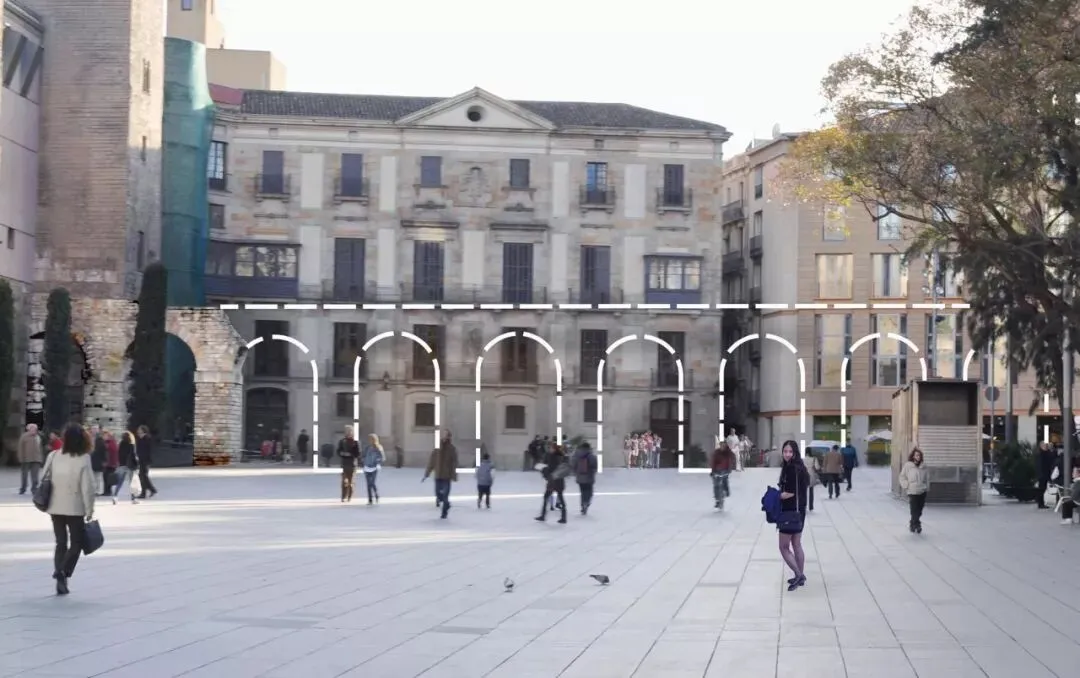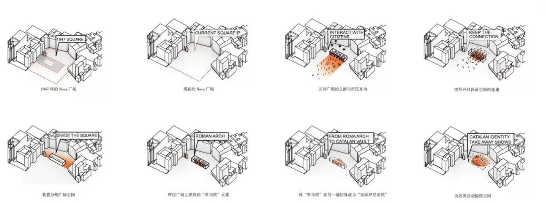 Plaza Nova 广场是从前的城门之一所在地,从广场角落残余的罗马拱门可以看到曾经重建的罗马输水渠。装置摆放在古罗马输水渠的位置,面向广场的一侧虚拟出其形状,仿佛是过去时光的重现,也暗示出巴塞罗那由罗马人建城的历史。装置同时在另一侧将加泰罗尼亚拱顶系统抽象化出挑构筑空间场所,巧妙再现了从罗马拱门到加泰罗尼亚拱顶的历史文脉。装置可做多种用途