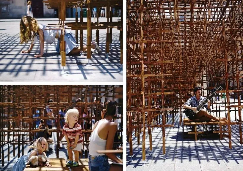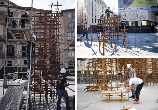 这种以单一构件搭建的体系是一种集体构建的形式,与著名的加泰罗尼亚传统活动“叠人塔”的传统相合,表达众志成城的意向。庆典结束后展馆可以拆卸再利用,用来制作其他装置或捣碎作为社区冬天取暖的有机燃料。装置建成后成为该广场最受欢迎的角落