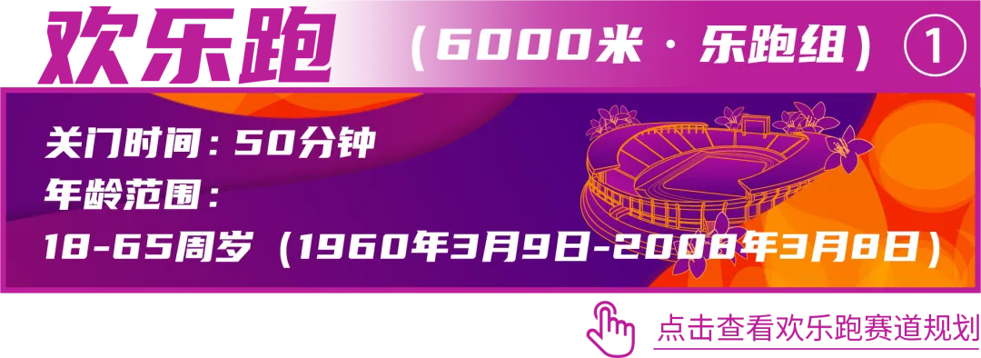 (3)欢乐跑:面向跑步爱好者公开报名,年龄限18-65周岁(1960年3月9日-2008年3月8日内出生);