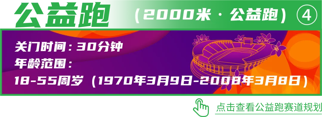 (6)公益跑:面向轮椅跑者和视障跑者公开报名,年龄限18-55周岁(1970年3月9日-2008年3月8日内出生),其中轮椅跑者禁止使用电动轮椅;