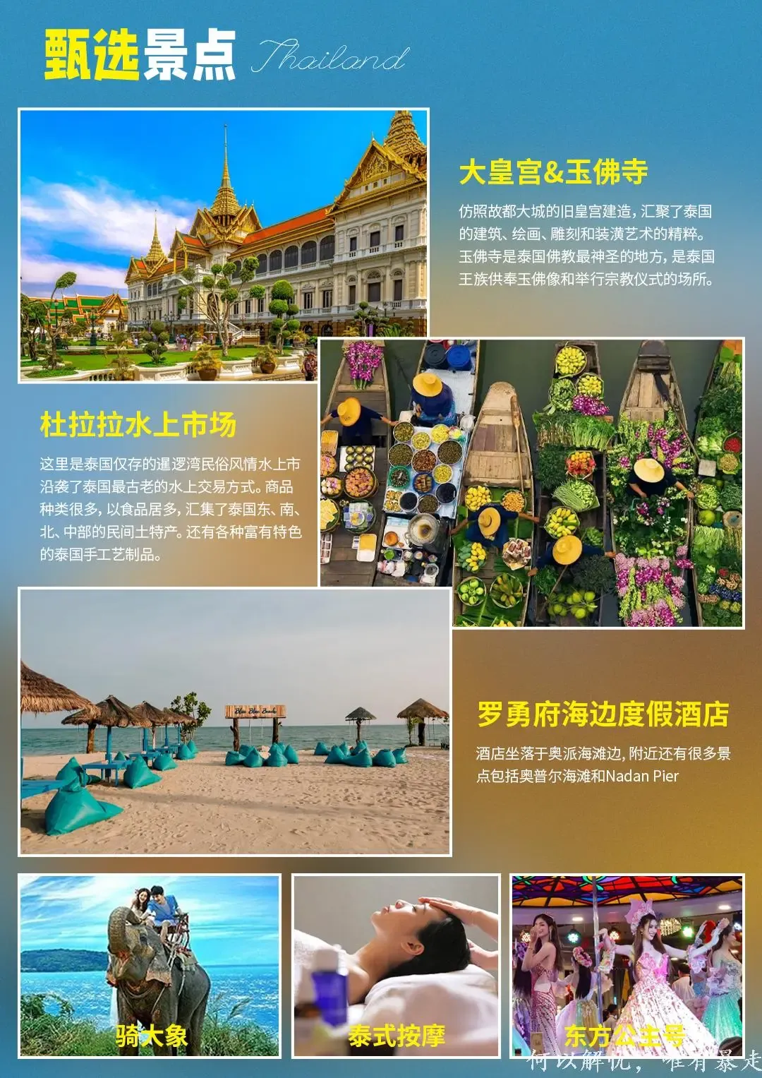 行程亮点:全程携程网五酒店+升级1晚国四诺富特网红必打卡:郑王庙·爽泰庄园·icon saim商场超值赠送:粉色沙滩饮料一杯·骑大象·泰式按摩经典不错过:快艇沙美岛·暹罗古城·东方公主号