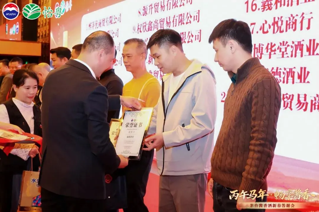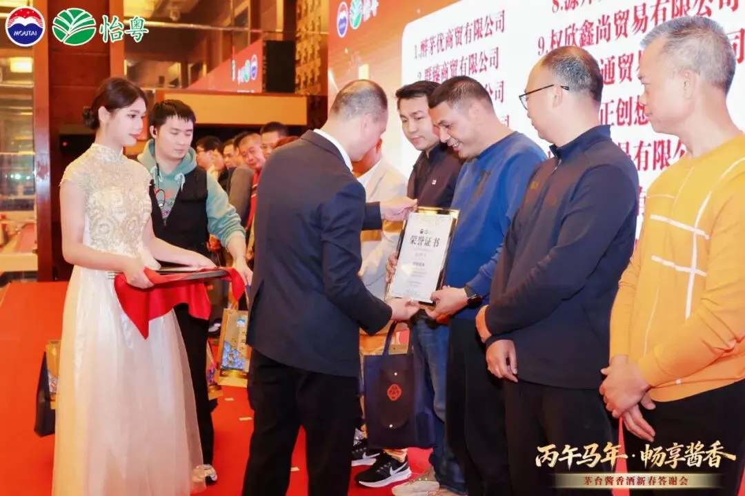 晚宴在一曲《恭喜发财》中拉开序幕,婉转歌声瞬间点燃全场喜庆氛围。主持人登台介绍来宾与流程后,贵州茅台酱香酒营销有限公司广东省区领导登台致辞,回顾过往合作历程,寄语未来携手共赢。随后,省区领导与经销商代表共同举杯,茅台1935 的醇厚酱香在觥筹交错间四溢,这款传承古法工艺的佳酿,酱香突出、口感柔和、回味悠长,尽显茅台酱香酒的品质精髓。