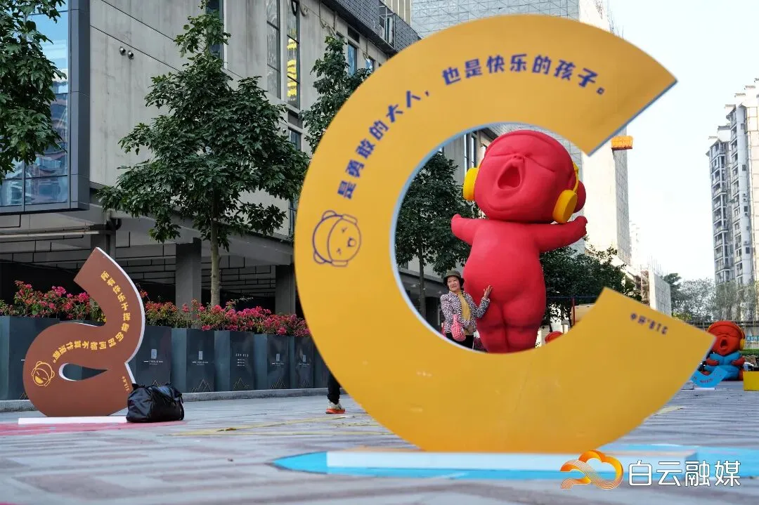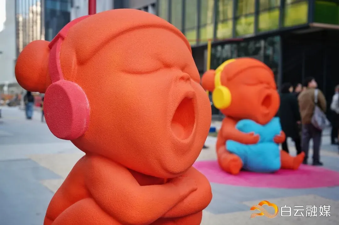 打破传统展厅边界,将艺术装置散落于街区与商业空间,核心展品为新锐艺术家张一鸣的“娃系列”雕塑。8件作品以扎总角发髻、闭目戴耳机的孩童为原型,或展现慵懒日常,或融入戏曲元素,传递纯粹松弛的生活态度,让市民在漫步中邂逅艺术、产生情感共鸣。
