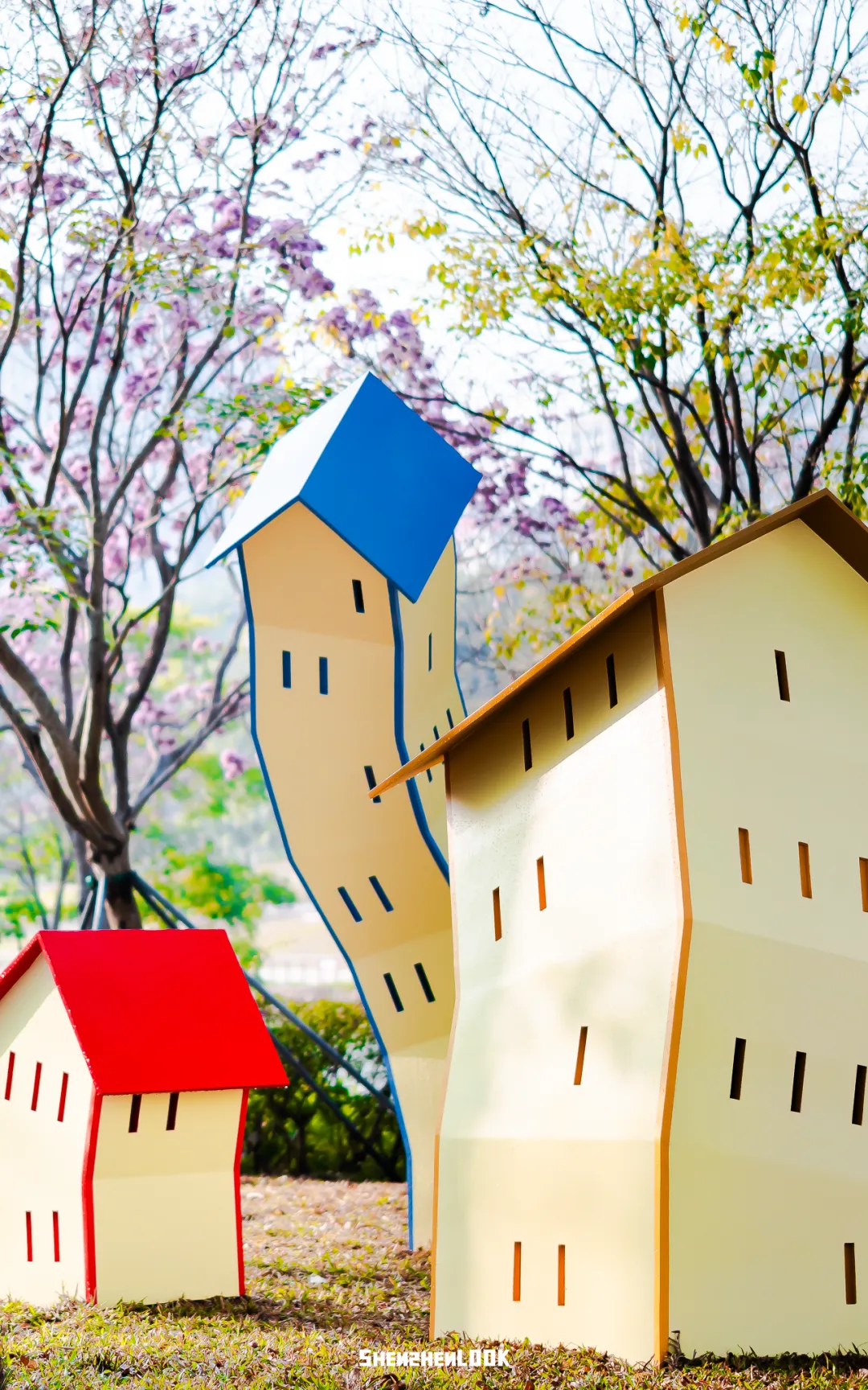 三座摇曳的彩色房子立在草坪上,色彩明亮,线条活泼,仿佛有着节奏和呼吸一般。充满童趣的场景让人不禁想起童年时的游戏场景,以其“纯真”打破了高校的“理性”,展示着一种自由舞动的思维状态。