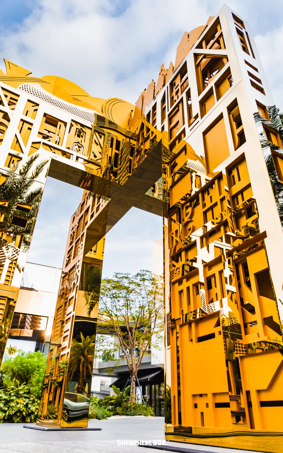 蛇口的十字路口边,伫立着一件金光灿灿的装置。两面墙交错,中间构造了一扇立体的门,墙上更是通过金属纹样刻画了深圳的城市地标、湾区的城市轮廓。
