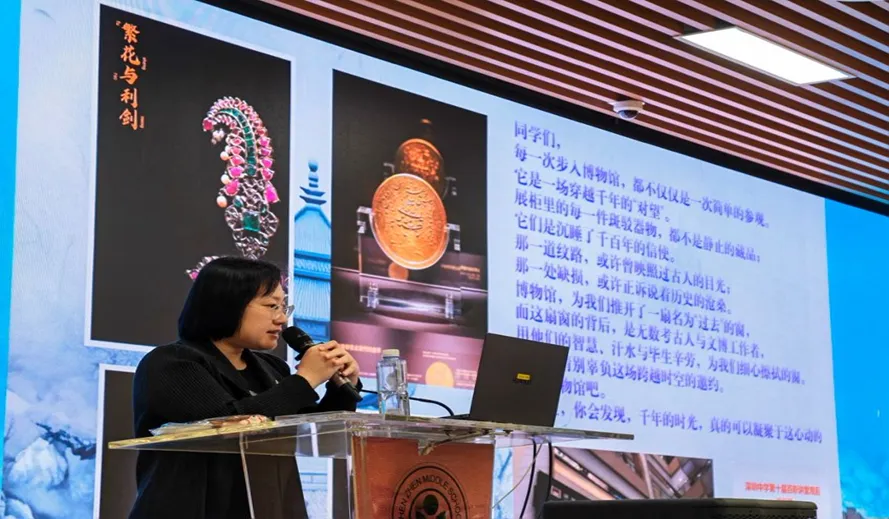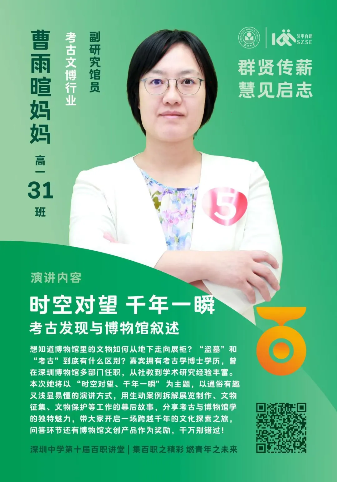 群贤传薪,慧见启志,第十届深圳中学百职讲堂走进 高一8、19、21、23、26、30班,此次活动我们有幸邀请到来自高一(31)班曹雨暄妈妈,一位资深的考古文博领域的学者,为大家带来穿越千年的对话,让我们了解考古学、文物、展览背后不一样的故事,是她(他)们默默的守护着这些看似冰冷,实则充满生命的记忆,让这些古老的声音被听见,让这些文明的火种永不熄灭,让穿越千年的智慧与美,继续滋养人类未来的旅程。