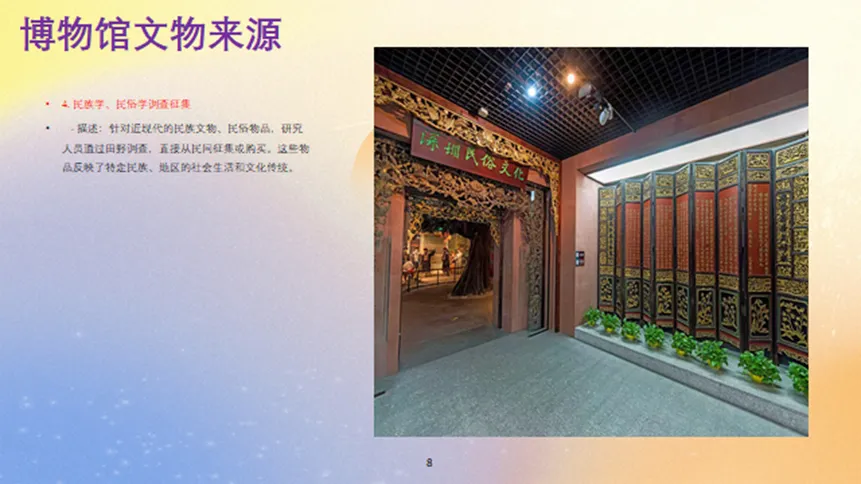 4. 民族学、民俗学调查征集:通过田野调查从民间收集近现代民族文物、民俗物品,记录鲜活的社会生活与文化传统。